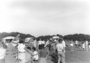 Verjaardag moeder de Wit. Feest op veld 2. In het midden staat Marianne van der Hoeven.