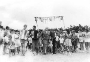 Circa 1956. Verjaardag moeder de Wit op de weg lopend naar het 'feestterein'. De accordeonisten zijn Hennie de Zwart (li) en Henny van der Wijngaard (re). Naast Henny zijn vader Riekus en met trommel Emiel van der Hoeven.