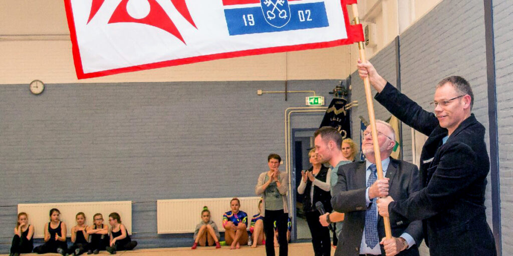 De nieuwe en eerste voorzitter van Gymsport Leiden Arthur Haasbroek toont vol trots het nieuwe vaandel. Naast hem bestuurslid Jan de Knegt.